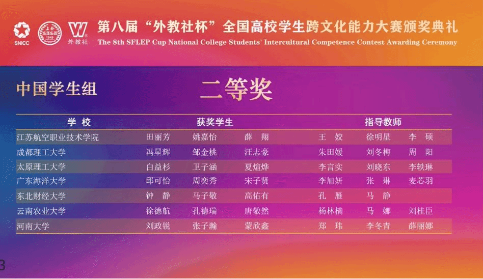 12月14日,第八届“外教社杯”全国高校员工跨文化能力大赛全国总决赛在上海外国语大学落下帷幕。由公司白益杉、卫子涵、夏煊烨三位同学组成的参赛团队,在李言实、刘晓东、李轶琳老师的精心指导下,凭借扎实的功底、出色的发挥与默契的配合,最终荣获全国二等奖,为山西省和公司赢得了荣誉。这一成绩不仅是公司在本项赛事中的历史性突破,也充分展现了公司学子的卓越风采与跨文化培养的丰硕成果。