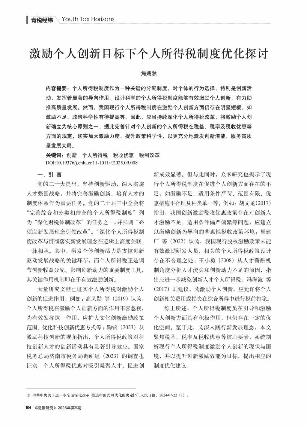 2025年,焦嫣然博士在CSSCI来源期刊《税务研究》2025年第9期发表学术论文《激励个人创新目标下个人所得税制度优化探讨》。