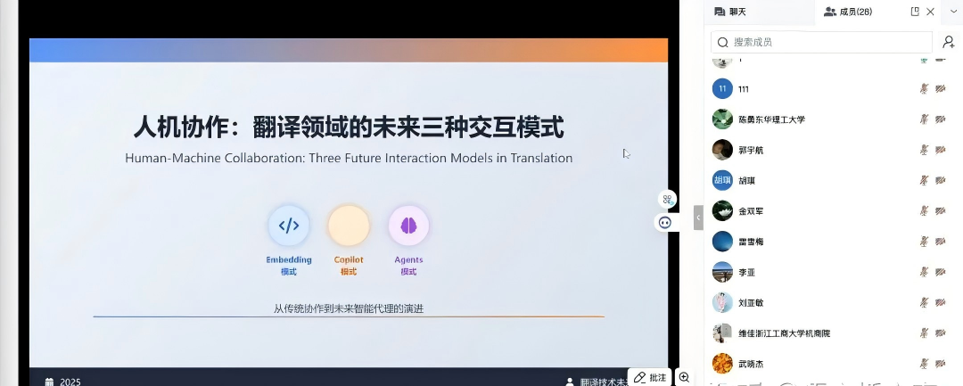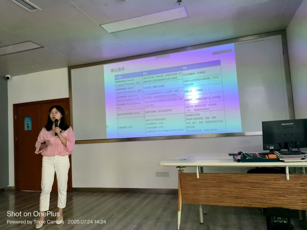大外部黄丽英、祁瑶老师参加“双师双能型”创新实践教学与大模型技术应用培训,培训由四川省翻译协会产校研融合发展研究中心,四川省翻译桥语言服务出口基地共同合作主办。围绕“人工智能赋能翻译教育”议题,共同探索AI在翻译教学中和实践中的深度结合。与会的专家分别从多个角度进行了报告,主题包括《ICT领域翻译特点与人才能力要求》,《数字化时代翻译行业语言人才培养新模态-产教融合校企共建》,《人工智能在语言服务行业的应用-人机协同流程》,《Agentic leadership: AI时代的人际共译》等,围绕人工智能与翻译教育这一核心,从教学应用、技术创新、翻译实践三个维度展开深度探索,展示了面向Ai的翻译教学新理念,为人工智能在今后虚拟教研室建设以及人工智能赋能翻译教学实践中提供新思路,构建适应智能时代的翻译人才培养新生态。