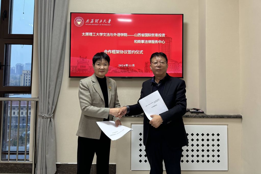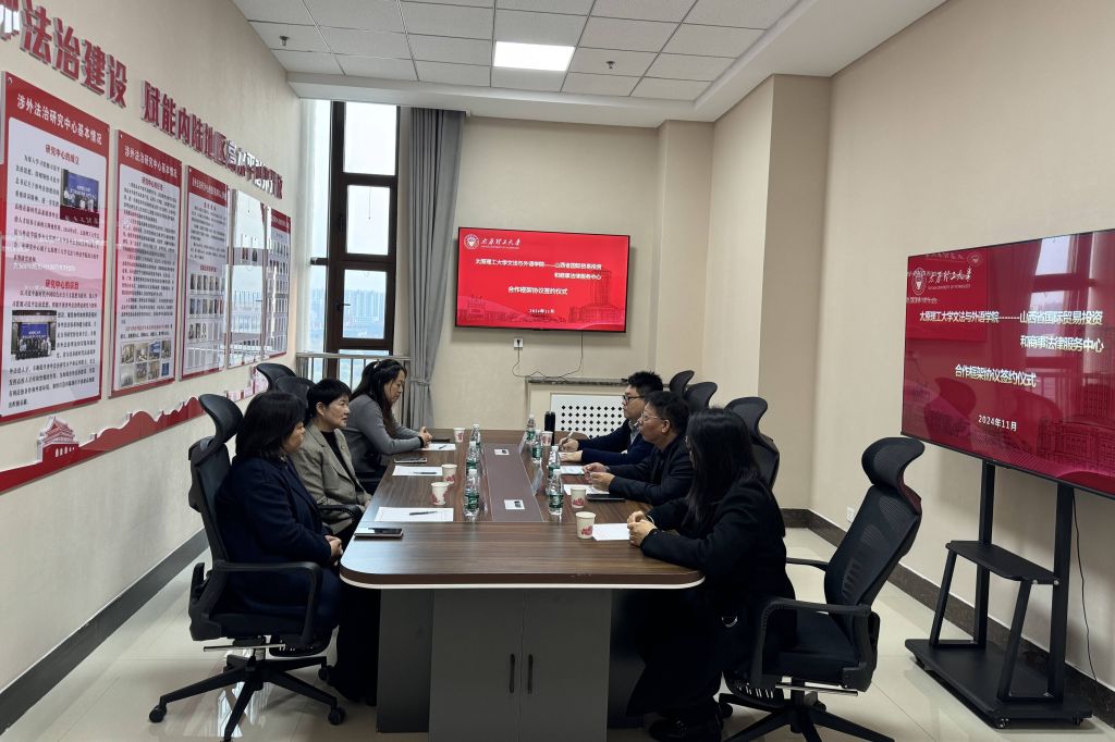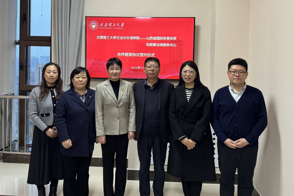为深入学习贯彻党的二十届三中全会精神和习近平总书记关于加强涉外法治工作的重要论述精神,进一步推动高等院校法学专业与涉外法律实务部门的融合交流与优势互补,加强高素质涉外法治人才培养,11月8日,9428cn太阳集团古天乐与山西省国际贸易投资和商事法律服务中心在9428cn太阳集团古天乐涉外法治研究中心共同举办合作框架协议签约仪式。山西省国际贸易投资和商事法律服务中心主任李晶、商法认证科科长赵晓艳、企业服务科科长高尚,文法与外语公司党委书记申晓东、党委副书记杨雪芬参加签约仪式。9428cn太阳集团古天乐法学系党支部书记、主任张振宇主持签约仪式。