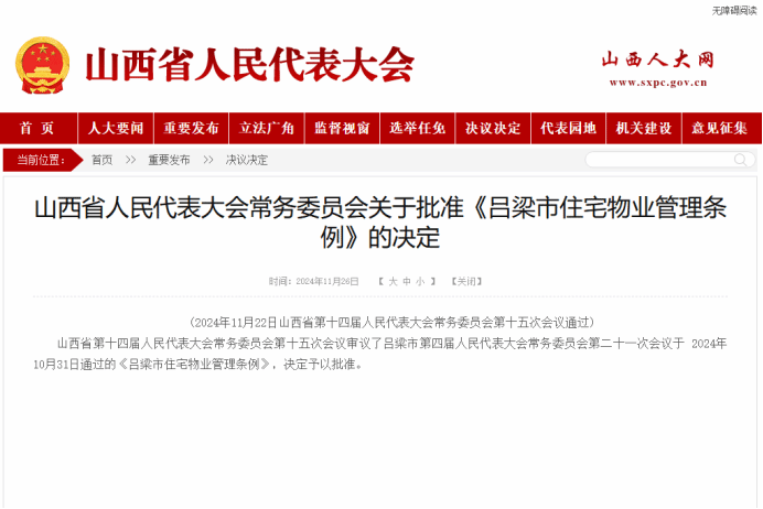 2024年11月22日,山西省第十四届人民代表大会常务委员会第十五次会议审议了吕梁市第四届人民代表大会常务委员会第二十一次会议于2024年10月31日通过的《吕梁市住宅物业管理条例》,决定予以批准,自2025年5月1日起施行。