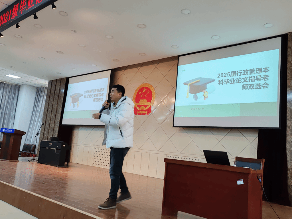 公共管理系主要教师和行政管理专业2021级全体本科生参加了本次会议。会议由杨光耀老师主持。杨光耀老师首先强调了毕业论文在本科教育中的重要性,他指出毕业论文不仅是对大学四年学习成果的全面检验,更是员工迈向社会、开启职业生涯的重要一步。每位同学都应高度重视,认真对待毕业论文的撰写工作。杨老师随后就毕业论文的撰写要求与流程,以及关键时间节点和注意事项进行了详细说明。
