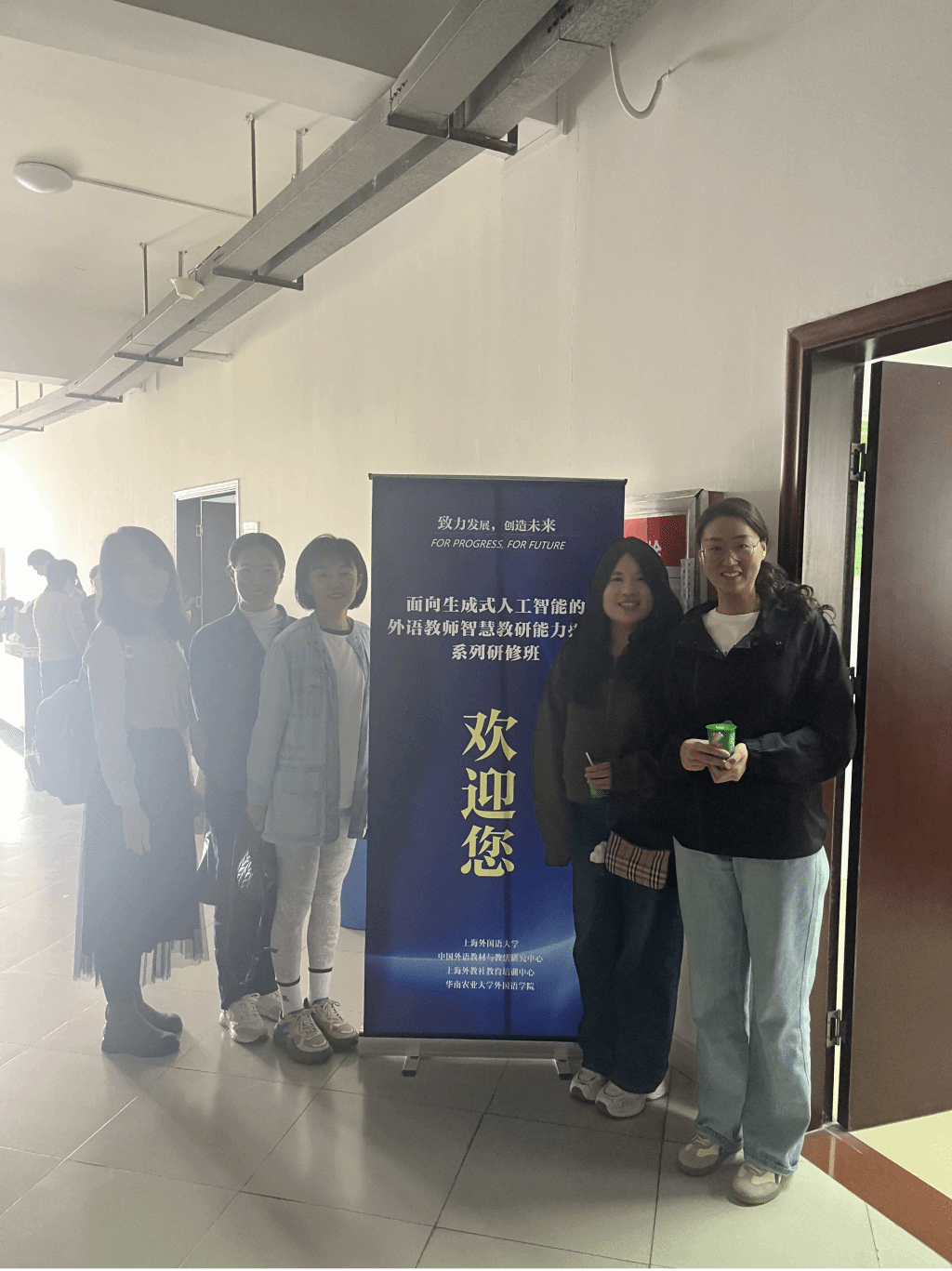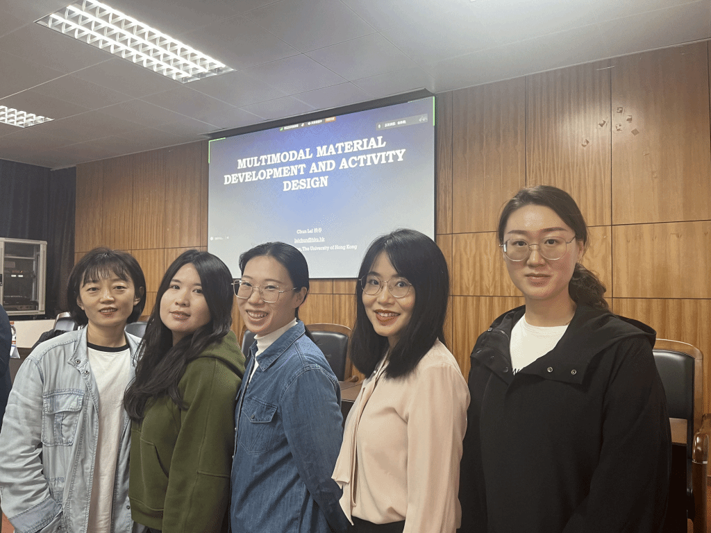 祁瑶、李慧艳、阎聆萱、胡佳、史晓媛五位教师远赴广州,参加“面向生成式人工智能的外语教师智慧教研能力提升”系列研修班Ⅲ:新形态外语教材与教法研究班。线下研修于2024年11月22-25日在位于广州市的华南农业大学举办,研修地点为华南农业大学外国语学院402学术报告厅。外语界知名专家学者就语言数字化转型、多媒体素材与资源开发、教师的媒体与智能素语料库技术与课堂教学、混合式学习与任务设计以及数字化赋能与智慧教研等话题展开讨论,五位教师以讲座、案例分析等方式参与,进一步学习了优化生成式人工智能在今后虚拟教研室(AI赋能教育云工作坊)建设中的推动作用。